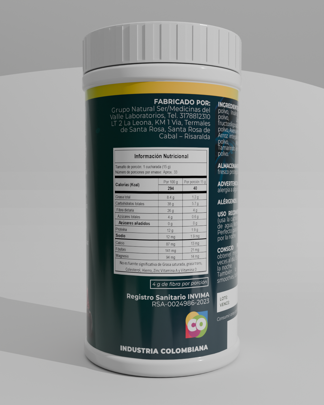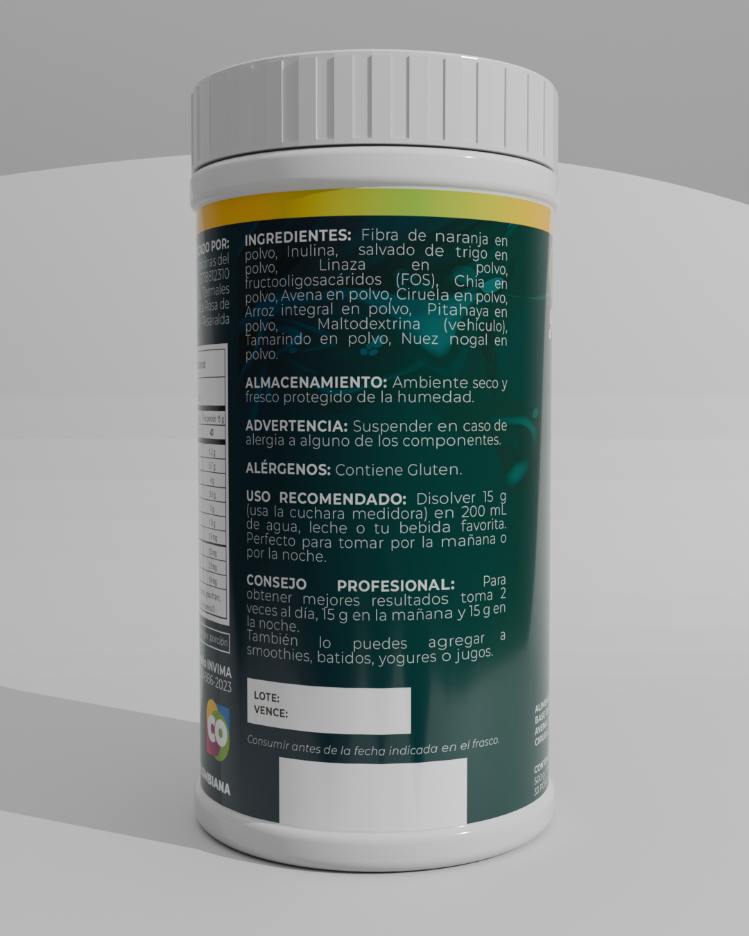 Fibra de naranja en polvo, inulina, salvado de trigo en polvo, linaza en polvo, fructooligosacáridos (FOS), chÃa en polvo, avena en polvo, ciruela en polvo, arroz integral en polvo, pitahaya en polvo, maltodextrina (vehÃculo), tamarindo en polvo, nuez nogal en polvo.
